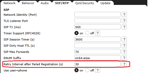 Setup - Advanced - SIP/RTP (Tab) - SIP (Section) - Retry interval after failed registration (s)